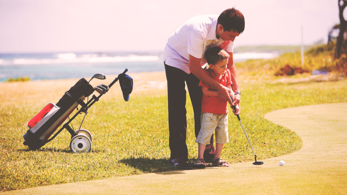 - Best course of action – When you arrive at the golf course avoid the driving range. Yes, avoid. Take them directly to the course and let them play – sort of. The adult plays the opening hole in normal fashion. Wait until you approach the fringe of the green before handing your child a putter and ONE ball. The putter is one of only three clubs that make up their first set. Let them put their hands on the putter and position the thumbs on the handle and their hands in the correct position based on their playing right- or left-handed. Start them putting from three feet off the green and let them continue to putt until they hole out (pace of play permitting).